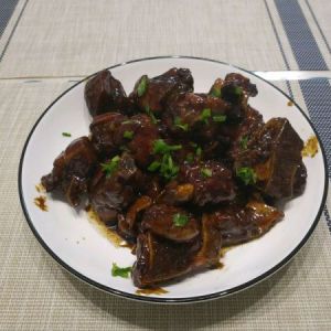 加入适量的老抽生抽至表面颜色如图片色。再加入三大勺白糖加入之前的排骨汤淹没排骨即可。