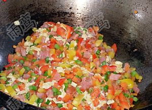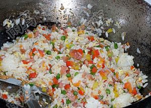放入米饭翻炒,放少许的盐,胡椒粉调味,将米饭和各种配菜炒透即可
