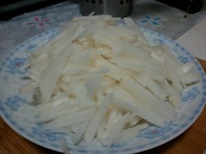 加入凉水,待煮沸后加入切好的白萝卜丝。盖锅盖大火煮沸,继续用中火煮20分钟