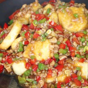 给煮好的汤勾个薄芡,最后把汤撒在豆腐上,即可