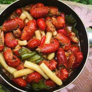 冷锅热油,下葱姜蒜爆炒,加一勺老干妈 两勺豆瓣酱炒香,下小龙虾爆炒加料酒和生抽。等虾壳变色后加水末过龙虾即可。放青椒和年糕煮10-20分钟。加盐和黑胡椒,试试味道就可以出锅了。