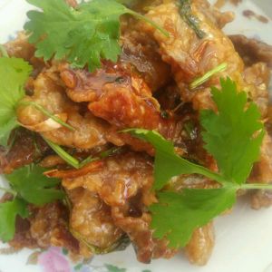 另取锅,放入一手勺水,加入碗汁,熬制枣红色,放入炸好的肉片,快速翻炒,使汁全部裹匀,淋明油,出锅装盘,撒香菜,白芝麻即可,。