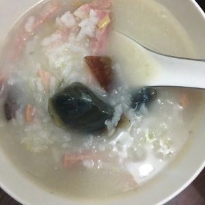 皮蛋,葱花,姜丝全部加入锅里,尝咸淡,我这刚刚好(火腿放的有点多,自己觉得够了就好)继续熬十分钟差不多关火(水如果放多了可以加淀粉勾芡)