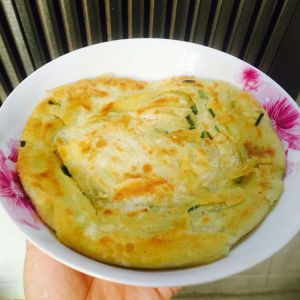 擀成片状,放入葱油酥卷成条状,再盘起来按扁擀成薄饼状