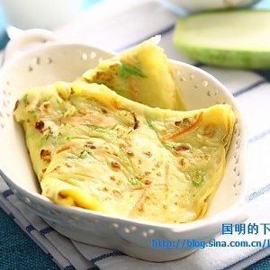西葫芦洗净,用擦丝器擦成细丝,放入容器,加2克盐腌10分钟至渗出菜汁儿,将胡萝卜也擦成丝状,葱切末,都放入西葫芦中。
