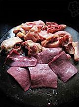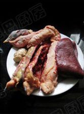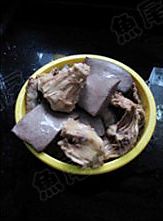 鸡壳洗干净,去皮切成块,猪横脷(猪胰)洗干净,去掉白色的肥膏,切成块。