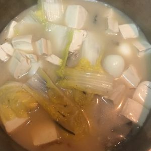 加开水,炖制汤汁发白,放入鹌鹑蛋、豆腐,加盐、胡椒粉调味