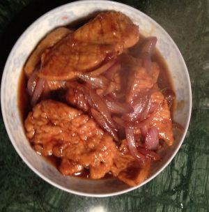猪排倒回锅内,加黄酒,加酱油,适量水煮开,白糖后下,盖上盖略焖。开盖加入洋葱拌匀,加鸡精少许提鲜,盛出。