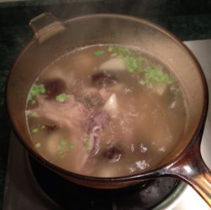 先将骨头飞水冲净,重新加水,葱,姜,料酒,小火煲汤。