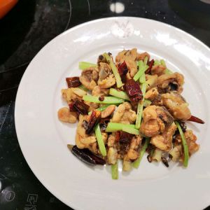 锅中留底油,将花椒干辣椒煸香,再放入葱姜蒜炒香。