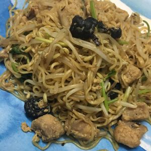 将腌好的龙利鱼丁先放锅里煎一下盛出,腌鱼的料汁备用。在锅里放入海参炒一会再陆续放放豆芽,面条、方便面里的酱包(没有酱包直接放蚝油)、腌鱼的料汁,炒熟盛出之前加入龙利鱼丁和香菜翻炒几下关火。