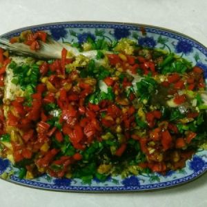 放锅里蒸20分钟后取出并倒掉盘里的水,并用凉开水倒入盘里冲洗鱼头同时沥干水(提鲜且让鱼肉口感更佳),把青椒鸡丁剁椒和葱花均匀地洒在鱼头上。