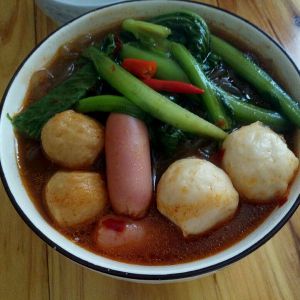 锅里水开,把丸子放进锅里煮五分钟,放豆瓣酱,焖两分钟