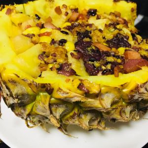 菠萝切成两半,掏出果肉。同时下锅煮米饭。