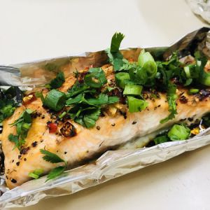 首先将生抽,盐,蒜,黑胡椒,辣椒粉,孜然粉均匀撒在三文鱼上,码味10分钟,然后放入锡箔纸内