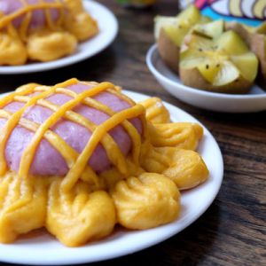 把紫色的面饼放在黄色面饼的中间;