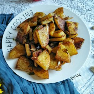 煎好的土豆块下锅煸炒,淋上少量酱油,翻拌均匀。再撒上黑胡椒粉,孜然粉,翻拌均匀,煸炒出香味。出锅,装盘。
