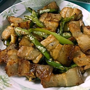 锅里放少量油,下蒜片煸炒,然后放入五花肉煸炒,等肉变色出油至八成熟