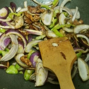 辣椒蒜爆香 加焯好的肉片,炒一下 加入甜面酱变色然后依次加入适量糖,蚝油味极鲜料酒,出锅前加入盐。OK