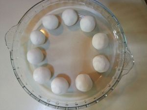 .放至不烫手的时候揉成团,面团以不硬不软为宜,太硬了汤圆不容易包上,太软了会很粘手。