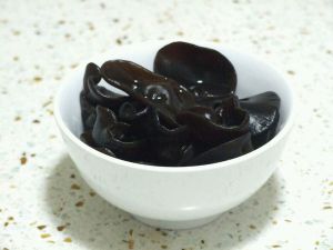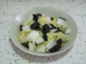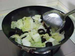 放入白菜、木耳、盐、鸡精, 转大火, 快速翻炒约2分钟至白菜出水、断生。