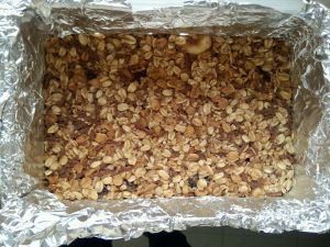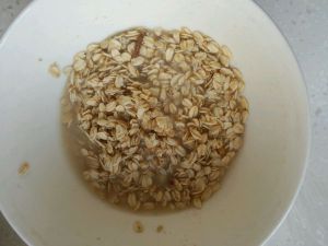 找一个方形的容器铺上锡纸,把燕麦铺进去压实。