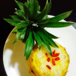 将拌好的菠萝饭装进掏空的菠萝,放入蒸锅蒸二十五分钟时枸杞放菠萝饭面上继续蒸五分钟