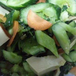 黄瓜拍碎斜刀切块,大蒜拍碎,胡萝卜切薄片,干豆腐卷切片,香菜切段。