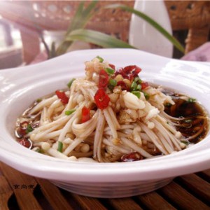 金针菇洗净切去头部,辣椒切粒、蒜头拍碎。