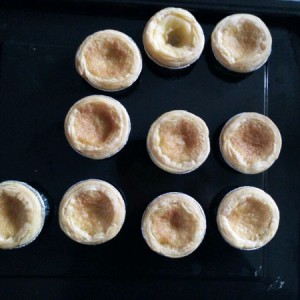 倒入蛋挞皮(蛋挞皮要提前软化)倒入8分满,烤箱预热170℃,拷到蛋挞皮发黄且蛋挞起焦斑即可