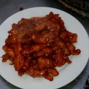 将炸好的里脊肉放入熬好的糖醋汁中,翻拌均匀。撒上芝麻。酸酸甜甜的糖醋里脊就完成了!!动筷!!