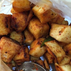 出锅前放绿辣椒调色,辣椒粉、孜然粉,少许盐,翻炒几下就可以出锅啦