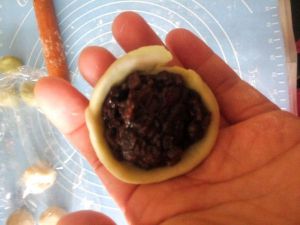 三次后从中间切开,平面向下压平,捏成片儿,包上馅儿。