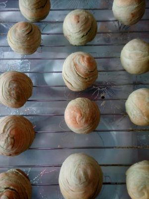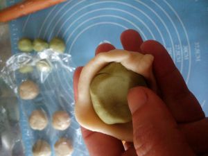 水油皮、油酥分成等数小份,水油皮摊开包住油酥,收口,口朝下。