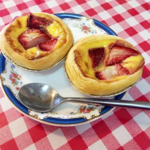 在蛋挞皮中加入草莓粒和八分满蛋挞水