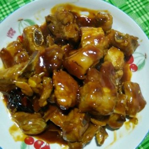 4.翻炒到猪肋骨变颜色,倒点开水,番茄酱,陈醋,有需要再加其他作料(鸡精之内的)开小火把汤汁烧干,汁干就可以起锅了。
