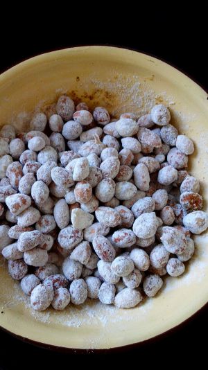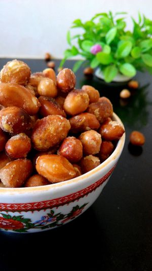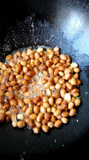 油温七十度下花生米,炸至表面凝固,转小火至熟透。