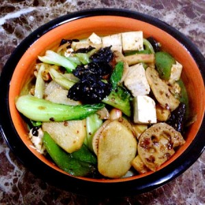 依次倒入土豆,莲菜,木耳翻炒片刻,适量加些盐和鸡粉,快出锅时再倒入豆腐和蔬菜