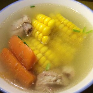 先把排骨洗干净 用开水烫10分钟 然后玉米切小条 胡萝卜切小条 放入高压锅加入料酒开始煮 时间设定在40分钟 到了40分钟之后 打开高压锅 放入香油 盐 鸡精 关上高压锅再煮20分钟 放气以后开锅加入香葱 喜欢的也可以放一些香菜 刚学会 不会做很复杂图 希望能帮到喜欢做菜的朋友