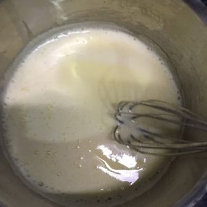 冷却的蛋液慢慢倒入奶油里,边倒边搅拌