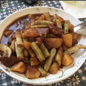 热锅下油,炒鸡肉,肉变色后放葱姜蒜、老抽,翻炒一下倒入土豆块,再翻炒一会倒入豆角继续翻炒
