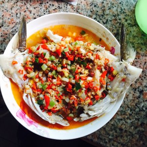 先将鱼头对斩,用姜,葱,盐,料酒码味。码好味20分钟后拿出鱼头装盘放入盘中,锅里加水烧开后把鱼头放锅里用大火蒸十分钟左右,鱼头蒸熟时加适量鸡精在鱼头上待用,