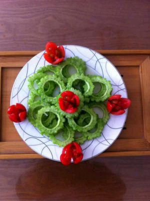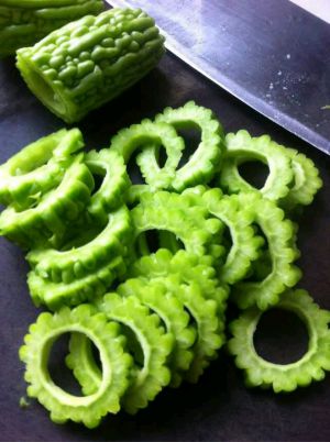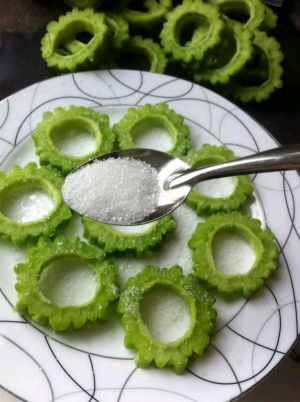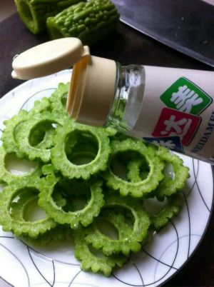 苦瓜洗净,用勺子扣去心,切片,备用。