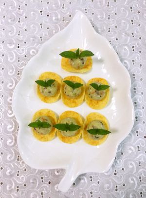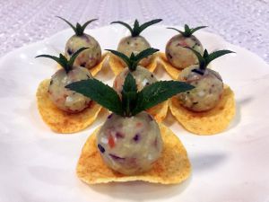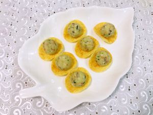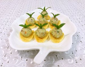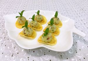 土豆泥用手搓成圆球型摆放在做装饰的薯片上。