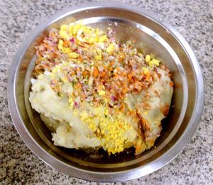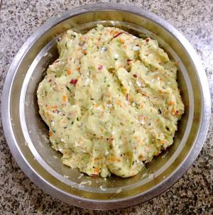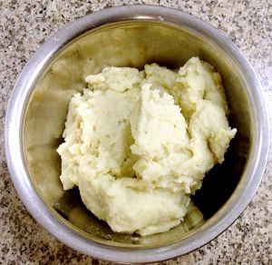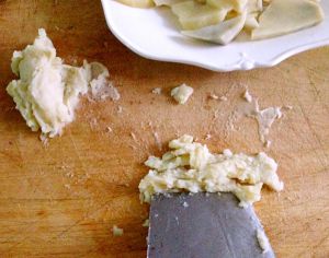 土豆凉好后放在菜板上用刀慢慢碾碎成泥即可。