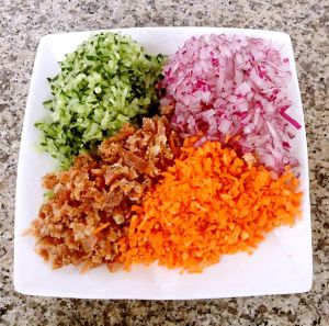 黄瓜、胡萝卜、圆葱、香肠切菜碎状备用