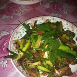 然后锅里面放糖,花椒油,鸡精,料酒少放点,再放点老抽,放老抽颜色会好看点。然后把蒜苗放入炒下即可出锅。