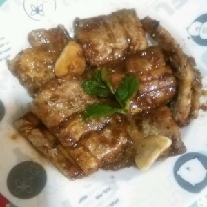 倒入带鱼,稍微翻炒一下,加入热水。放入,陈醋,生抽,老抽,蒜瓣。