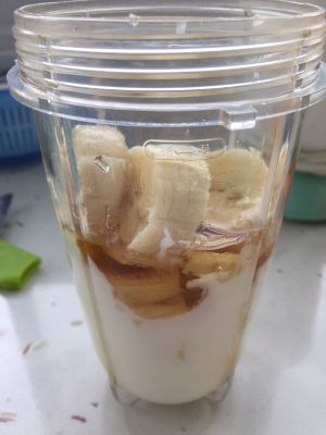 在搅拌杯里加入酸奶、香蕉、蜂蜜
