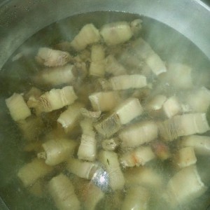 选用上好的五花肉,切1CM见方的小块。放开水里焯一下。我家自己养的猪,有点肥o!